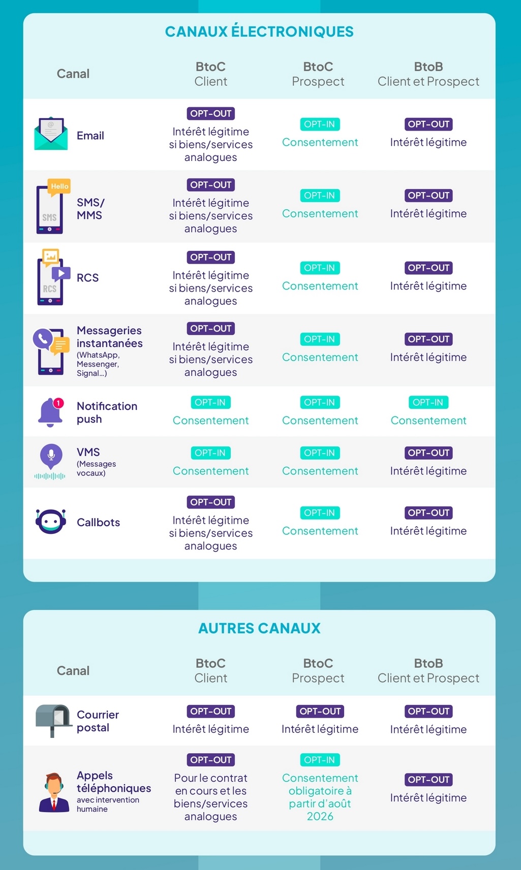 Ainsi, l’infographie 2026 propose une lecture synthétique de cet ensemble normatif, en distinguant deux bases légales possibles en matière de prospection : le consentement préalable (opt-in), et l’intérêt légitime (opt-out), sous réserve du respect du droit d’opposition.