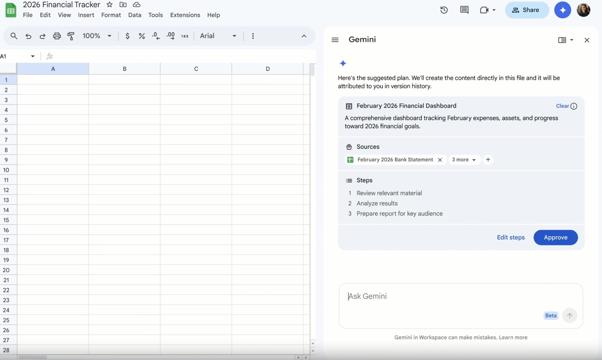 Les nouveautés ne se limitent pas au traitement de texte. Dans Google Sheets, Gemini peut désormais générer une feuille de calcul complète à partir d’un simple prompt.