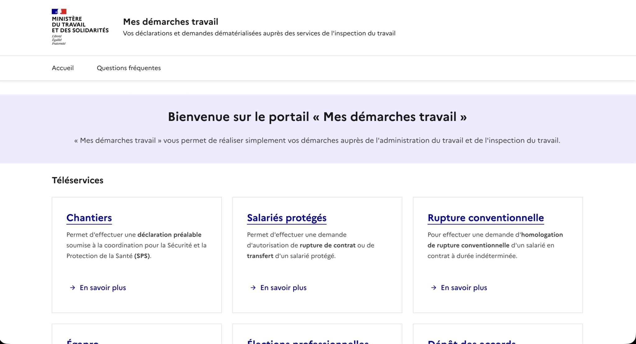 Accessible depuis l’adresse mesdemarches.travail.gouv.fr, le portail regroupe plusieurs services en ligne déjà bien connus des professionnels. Parmi eux, TéléRC pour l’homologation des ruptures conventionnelles, ÉgaPro pour la déclaration de l’index d’égalité professionnelle ou encore TéléAccords pour le dépôt des accords d’entreprise.