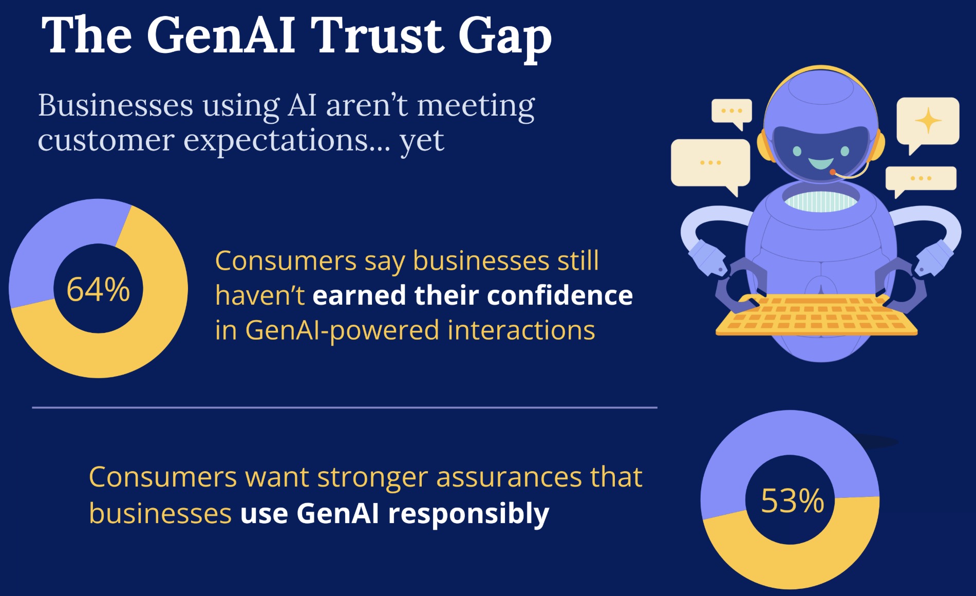 L’étude montre que 64% des personnes interrogées estiment que les entreprises n’inspirent pas suffisamment confiance lorsqu’elles utilisent l’IA générative dans leurs interactions, et 53% expriment également des doutes sur l’usage responsable de ces technologies.