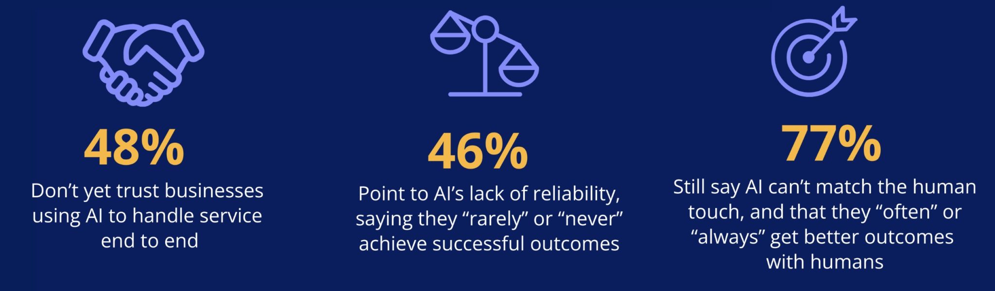 Plus révélateur encore, 48% affirment ne pas faire confiance aux entreprises pour gérer entièrement leurs demandes via l’IA. Cette préférence ne tient pas seulement à l’efficacité perçue, mais aussi à des dimensions plus subtiles comme l’empathie, la compréhension contextuelle ou la capacité à arbitrer des situations complexes.